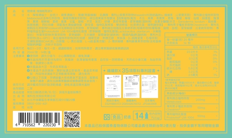 「纖纖輕鬆飲X」獲得了35項原料專利,同時也通過了SGS檢測,品質安全有保障。