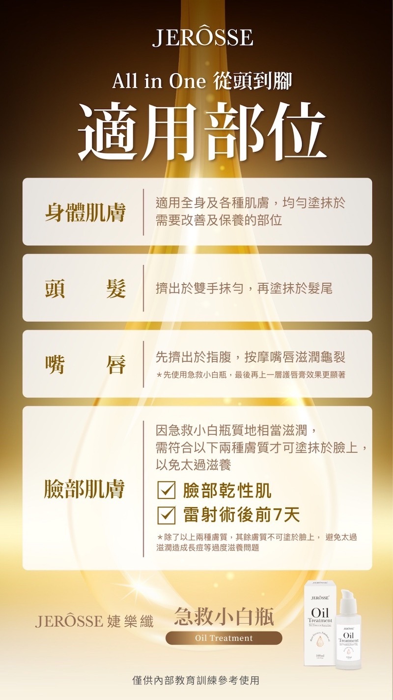 2.僅有臉部乾性肌膚,或是雷射手術後前7天可以使用在臉上,以免過度滋養。
