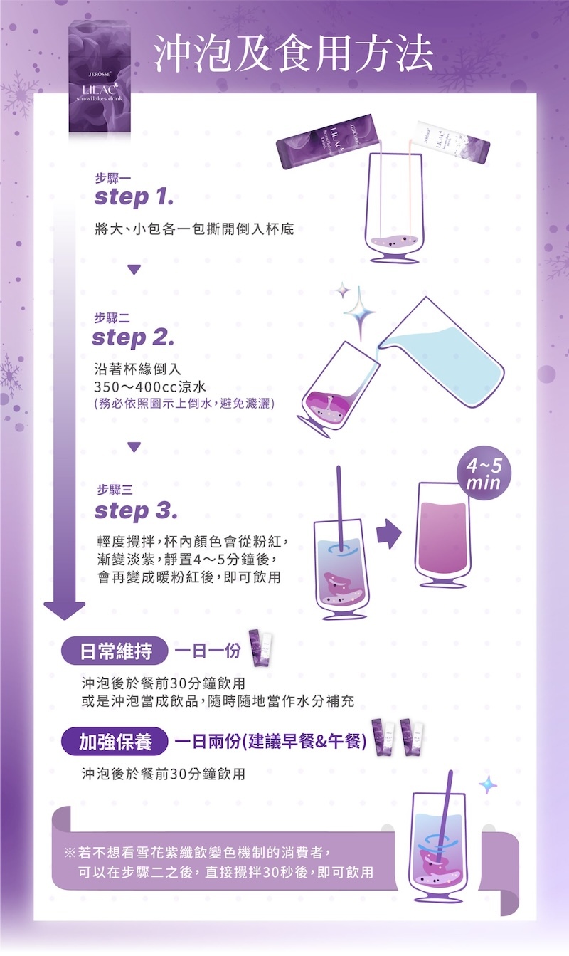 此外,透過分開包裝的方式,也增加消費者彈性使用搭配,可以單獨沖泡蔓越莓粉包,或者也可以將雪花粉包搭配肽纖飲一起沖泡。